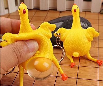 Olvida esos momentos malos del dia con este llavero super original . Este pollo llavero solo necesita ser apretado en el vientre para que salga un saco de huevos entre sus patas.