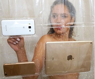 Así que realmente no quieres perderte esas entradas, pero necesitas ducharte. Esta cortina resuelve tu problema. Lleva tus teléfonos y tablets a la ducha contigo. Soporta hasta 17 de ellas y te permite acceder a la pantalla táctil a través de la cortina mientras las mantiene secas al mismo tiempo.