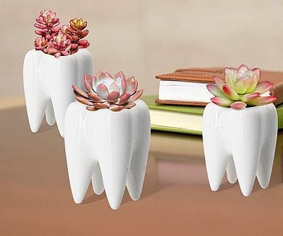Los dientes sirven para más que comer, también son buenos para decorar. Este encantador conjunto de macetas molares es un hogar perfecto para suculentas y plantas aéreas. Solo no le digas a tu dentista que ya tiene caries… Esta vez es algo bueno.