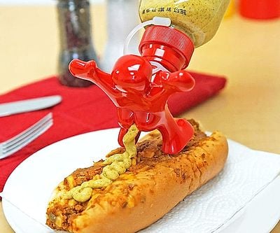 Nunca volverás a ver la salsa barbacoa igual después de que salga del de este adorno de botella de condimento de hombre que hace caca. El pequeño se enrosca directamente en la parte superior de tus botellas de condimentos favoritas y expulsa el aliño de su agujero de caca sobre tu snack favorito.
